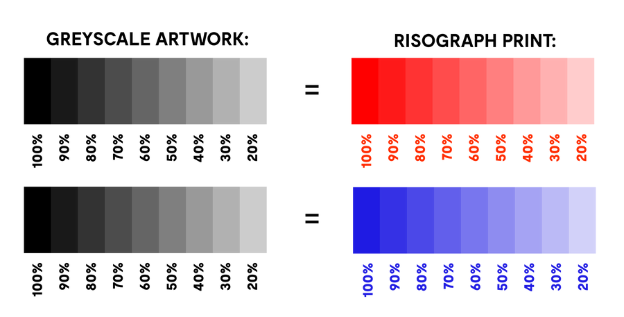 The riso is very sensitive and will register different shades of black which will be visible in the printed output. So please ensure all tones of black have the same settings if you intend their output to be the same. The different opacities of greyscale, are represented as different opacities of your chosen colour.