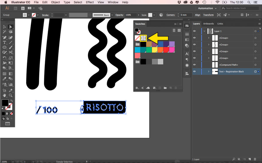 Change text/graphics layers that are need to be printed crisp and solid to ‘Registraion Black’. Don’t use this black for large areas of solid colour though.